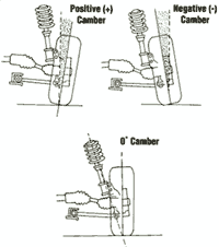 Camber: Cambervinkeln är hjulets lutning i sidled. Vinkeln förändras när bilen svänger och utövar sidledes kraft på däcket, som deformeras av kraften. En lätt negativ vinkel, kanske en halv grad, brukar ge bilen bästa möjliga grepp när det svänger. |