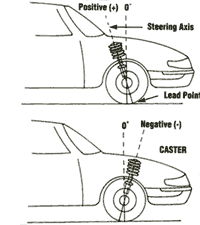 Caster: Castervinkeln anger hur mycket styrspindeln lutar bakåt. Vinkeln gör att framhjulet vill ställa in sig i rakt-fram läge vid färd, eftersom hjulets kontaktpunkt med marken hamnar bakom den punkt där styrspindellinjen skär marken. Sträckan mellan punkterna kallas försprång, och den behövs för att bilen inte skall kännas nervös. |
