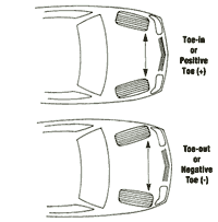 Toe-in: Toe-in-vinkeln anger hur mycket hjulen pekar mot varandra, framåt. Det skapar stabilitet för hjulen i hög fart och gör även att däcksslitaget minskar. Däremot minskar beredvilligheten att svänga snabbt. |